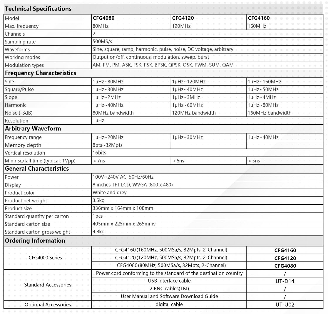 The CFG4000 Series is a waveform generator with high sampling rate up to 500MS/s, MAX waveform length up to 32Mpt. To generate stable, precise, low distortion signals. The CFG4000 Series adopts Direct Digital Synthesizer (DDS) technology. User-friendly interface design with high resolution 8 inches display screen and rational panel layout to improve operational efficiency