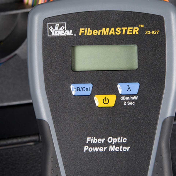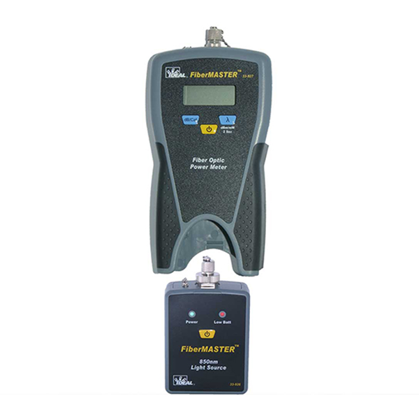 The IDEAL FiberMASTER™ fibre optic testing kit allows the user to measure absolute power and calculate the loss of fibre optic links at several wavelengths. Absolute power measurements are helpful when trouble shooting equipment that may not be operating properly. The dB calibration feature allows the operator to set a reference level to the light source and directly read the loss of fibre optic links without needing to manually calculate the values. The unique form factor allows the light source to be docked neatly within the power meter. This makes the kit compact for easy storage while still allowing full operation of both the source and meter.