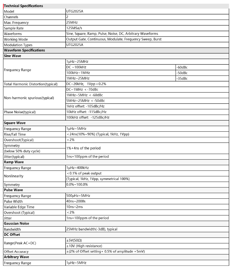 UTG2000A series function / arbitrary waveform generator is designed by direct digital frequency synthesis (DDS) technology and can produce accurate, stable and low distortion output signals. The series of instruments 125 MS/s sampling rate, and 14-bit vertical resolution. It has equivalent dual channel independent output,Built-in 200 arbitrary waveforms , Meet the requirements of most applications in basic testing.
