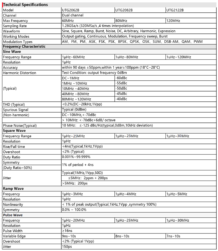 UTG2000B series can produce high precision, stable, pure and low distortion signals; provide high frequency square wave with quick rise and fall edges. Users can improve their working efficiency by using the multifunctional instrument of easy operated interface, competitive specifications and humanized graphical display.