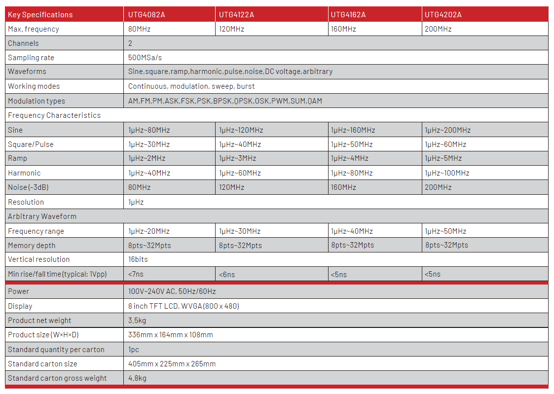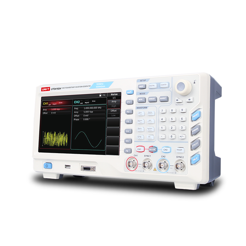 The UTG4000A Series waveform generators are applied to a wide range of application domain,integrating multiple waveforms for Function Generation, Arbitrary Waveform Generation,Pulse Generation,Harmonic Generation,Analog/Digital Modulation source. The UTG4000A Series is a waveform generator with high sampling rate up to 500MS/s, MAX waveform length up to 32Mpt. To generate stable, precise, low distortion signals The UTG4000A Series adopts Direct Digital Synthesizer (DDS) technology. User-friendly interface design with high resolution 8 inches display screen and rational panel layout to improve operational efficiency