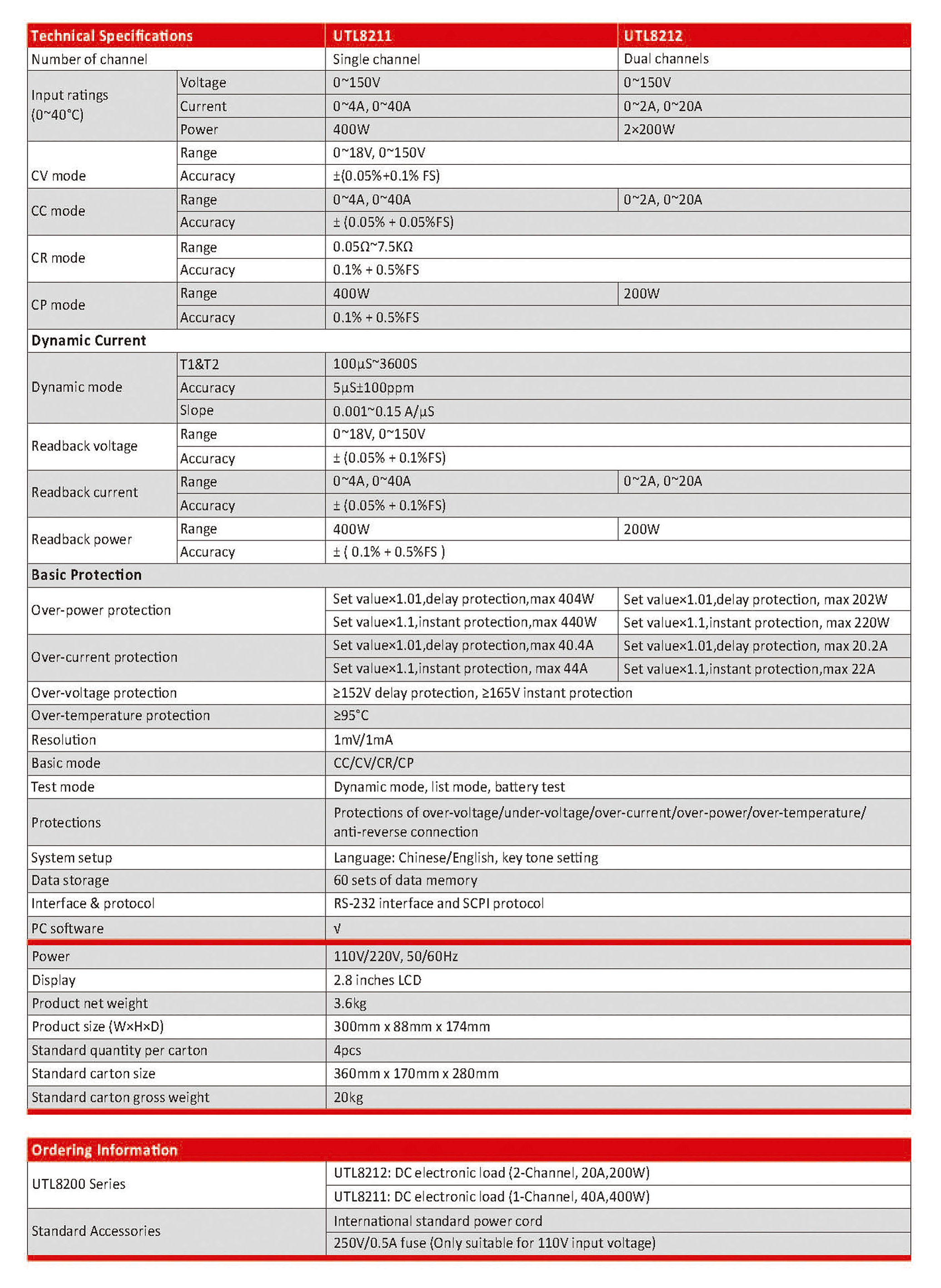 The UTL8200 Series designed for users requiring a DC load with a compact form factor which is widely used in basic applications such as product production line and maintenance. Small size, easy operation, rich testing functions and modes, support for dual-channel independent testing, the standard RS-232 interfaces for remote communication to meet your diversified test requirements, easy to connect seamlessly with automatic production line and automatic test system (ATS). With a wide range of power measurement, voltage and current measurement speed up to 40kHz, test resolution up to 1mV/1mA, the UTL8200 series is a cost-effective DC load with performance specifications that rival any instrument in its class.